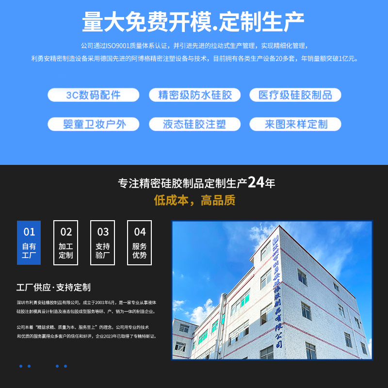 利勇安硅膠始終堅(jiān)持誠(chéng)信務(wù)實(shí)的工作態(tài)度,專(zhuān)注技術(shù)創(chuàng)新與品質(zhì)提升 致力于打造高質(zhì)量硅膠產(chǎn)品,持續(xù)深耕汽車(chē)、智能穿戴、母嬰用品、3C電子、醫(yī)療行業(yè)與電子霧化等多個(gè)領(lǐng)域。專(zhuān)注液態(tài)硅膠制品精密技術(shù)研發(fā)24年。
