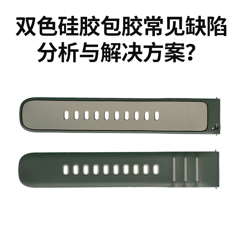 雙色硅膠包膠常見缺陷集中在結(jié)合不牢(脫層)、定位偏差(錯模)、氣泡、飛邊、表面不良、硫化異常六大類,核心源于 “兩次成型的材料兼容性、模具定位精度、工藝參數(shù)匹配度”,具體分析與解決方案如下: